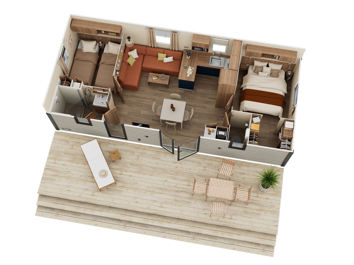 Nouveau modèle 2 chambres de la Gamme IRM Habitat 2026, le Mimosa bénéficie d'un dressing dans chambre parentale... et de tout le confort du Haut de gamme !!!